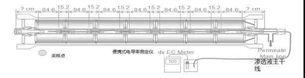 如流量增加而脱盐率下降,在任何测量值显著升高的情况下,应检查所有膜壳的产水电导率。针对有明显问题的任何一根管道,可以采用“中心管测试方法”来识别哪支膜元件。具体测试包括将软管伸入螺旋卷绕元件的中心管,一直到压力管的末端,然后慢慢地将其拉出,获取软管中的部分渗透液。然后对样品的电导率进行测试。如果某一点的值突然升高,可根据已经拉出的软管长度来确定泄漏的位置。
